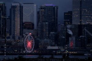 FOTO DE ARCHIVO: Las luces de las habitaciones de hotel forman un corazón en el Hyatt Regency Seattle, cerca de la Gran Rueda de Seattle, durante el brote de la enfermedad por coronavirus (COVID-19) en Seattle, Washington, Estados Unidos. 2 de abril, 2020. REUTERS/David Ryder/Archivo