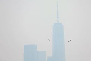 The One World Trade Center tower in lower Manhattan is shrouded in haze and smoke which drifted south from wildfires in Canada, in New York City, New York, U.S., June 6, 2023. REUTERS/Mike Segar