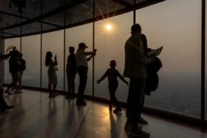 People take photographs as a smokey Toronto is seen from the CN Tower as wildfires in Ontario and Quebec continue to burn, in Toronto, Ontario, Canada June 6, 2023. REUTERS/Carlos Osorio