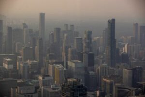 A smokey Toronto skyline is seen from the CN Tower as wildfires in Ontario and Quebec continue to burn, in Toronto, Ontario, Canada June 6, 2023. REUTERS/Carlos Osorio