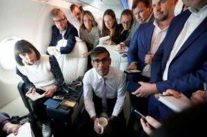 British Prime Minister Rishi Sunak holds a huddle with political journalists on board a government plane as he heads to Washington, U.S., June 6, 2023. Niall Carson/Pool via REUTERS