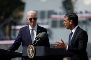 FILE PHOTO: British Prime Minister Rishi Sunak delivers remarks on the Australia – United Kingdom – U.S. (AUKUS) partnership, after a trilateral meeting with U.S. President Joe Biden and Australian Prime Minister Anthony Albanese, at Naval Base Point Loma in San Diego, California U.S. March 13, 2023. REUTERS/Leah Millis/File Photo