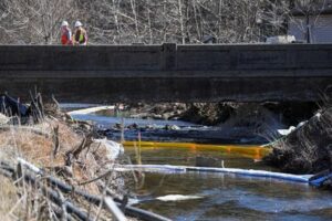 FILE PHOTO: People work as they clean up the site following the derailment of a train carrying hazardous waste in East Palestine, Ohio, U.S., February 23, 2023. REUTERS/Alan Freed
