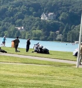 Una vista muestra a la policía que parece arrestar a alguien en el lugar donde una persona hirió a cuatro niños y un adulto en un ataque con cuchillo en un parque en Annecy, Francia. 8 de junio de 2023, en esta captura de pantalla obtenida de un vídeo de las redes sociales. Anthony Le Tallec vía Instagram/vía REUTERS. ESTA IMAGEN HA SIDO SUMINISTRADA POR TERCEROS. CRÉDITO OBLIGATORIO.