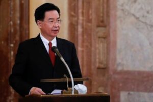FOTO DE ARCHIVO: El ministro de Asuntos Exteriores de Taiwán, Joseph Wu, habla tras recibir la Medalla Conmemorativa de Plata del Senado del Parlamento de la República Checa, en Praga, República Checa, 27 de octubre de 2021. REUTERS/David W Cerny/File Photo