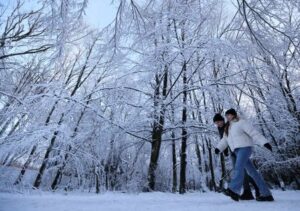 FILE PHOTO: People walk among trees covered in snow, at the Signal de Botrange in the nature reserve of Les Hautes Fagnes (The High Fens), in Waimes, Belgium January 17, 2023. REUTERS/Yves Herman/File Photo