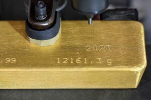 FILE PHOTO: A machine engraves information on an ingot of 99.99 percent pure gold during production at Krastsvetmet precious metals plant in the Siberian city of Krasnoyarsk, Russia, January 31, 2023. REUTERS/Alexander Manzyuk