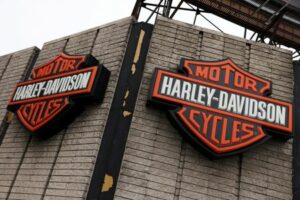 FILE PHOTO: The logo of Harley-Davidson motorcycles is seen at a dealership in Queens, New York City, U.S., February 7, 2022. REUTERS/Andrew Kelly
