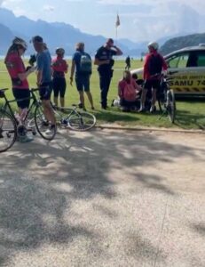 A group of cyclists stand with police at the site where a person wounded four children and an adult in a knife attack in a park in Annecy, France June 8, 2023, in this screen grab obtained from social media video. Anthony Le Tallec via Instagram/via REUTERS