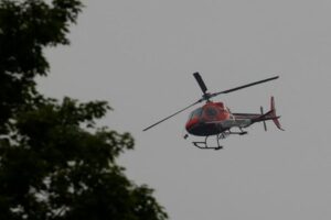 A helicopter prepares to land in a staging area near a forest fire that has been burning since Sunday on the shore of Centennial Lake in the Township of Greater Madawaska, Ontario, Canada, June 7, 2023. REUTERS/Blair Gable