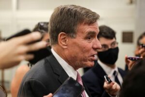 FILE PHOTO: U.S. Senator Mark Warner (D-VA) faces reporters in the Senate subway at the U.S. Capitol in Washington, U.S., October 6, 2021. REUTERS/Evelyn Hockstein