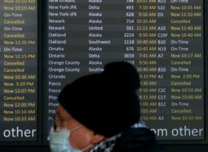 FILE PHOTO: A traveler walks past a screen showing dozens of flights listed as cancelled or delayed at Seattle-Tacoma International Airport (Sea-Tac) in Seattle, Washington, U.S. December 27, 2021. REUTERS/Lindsey Wasson