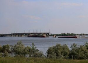 Destroyed Antonivskyi bridge is seen over the flooded Dnipro river after the Nova Kakhovka dam breached, amid Russia’s attack on Ukraine, near Kherson, Ukraine June 8, 2023. REUTERS/Stringer