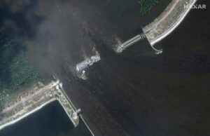 FILE PHOTO: A satellite image shows the Nova Kakhovka Dam and hydroelectric plant after its collapse, in Nova Kakhovka, Ukraine June 7, 2023. Maxar Technologies/Handout via REUTERS/File Photo