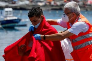 FOTO DE ARCHIVO: Un miembro de la Cruz Roja asiste a un migrante tras su desembarco de un barco de guardacostas español en el puerto de Arguineguín, en la isla de Gran Canaria, Canarias, España, el 30 de mayo de 2023. REUTERS/Borja Suárez