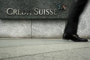 FILE PHOTO: A pedestrian walks past a logo of Credit Suisse outside its office building in Hong Kong, China March 21, 2023. REUTERS/Lam Yik/
