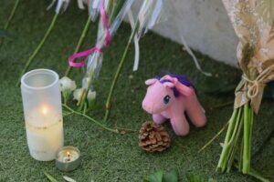 A view of a toy, flowers and candles left at the Le Paquier park after several children and adults were injured in a knife attack, near the lake in Annecy, in the French Alps, France, June 9, 2023. REUTERS/Denis Balibouse