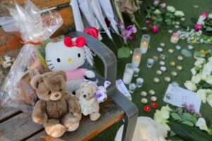 A general view of flowers, candles and toys left at the Le Paquier park after several children and adults were injured in a knife attack, near the lake in Annecy, in the French Alps, France, June 9, 2023. REUTERS/Denis Balibouse