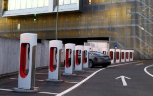 ARCHIV: Tesla-Ladestationen auf einer Autobahnraststätte bei Affoltern am Albis, Schweiz, 20. Oktober 2021. REUTERS/Arnd Wiegmann