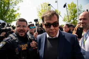 FILE PHOTO: U.S. Representative George Santos (R-NY) is escorted by police as he leaves Central Islip Federal Courthouse in Central Islip, New York, U.S., May 10, 2023. REUTERS/Eduardo Munoz/File Photo