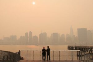 People watch the sunset as haze and smoke caused by wildfires in Canada hang over the Manhattan skyline, in New York City, New York, U.S., June 7, 2023. REUTERS/Andrew Kelly