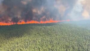 Smoke rises from a wildfire in Tumbler Ridge, British Columbia, Canada, in this screen grab taken from a video, June 8, 2023. BC Wildlife Service/Handout via REUTERS