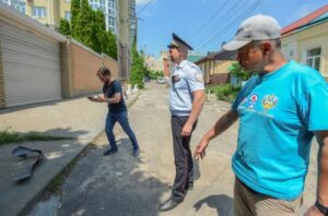 A police officer stands guard as a journalist films near a damaged multi-storey apartment block following a reported drone attack in Voronezh, Russia June 9, 2023. REUTERS/Vladimir Lavrov