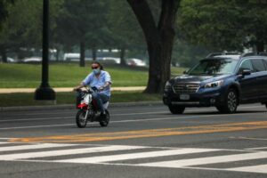 FILE PHOTO: A person on a mini bike wears a mask as haze and smoke caused by wildfires in Canada reaches Washington, U.S., June 8, 2023. REUTERS/Amanda Andrade-Rhoades