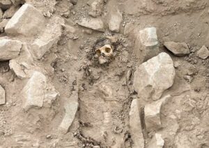 Los restos de una momia, que se cree que pertenecen a la cultura Manchay, que se desarrolló en los valles de Lima entre 1.500 y 1.000 a.C., aparecen en la excavación de un yacimiento prehispánico, en Lima, Perú, el 14 de junio, 2023. REUTERS/Anthony Marina