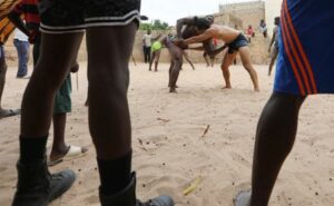 Shogo Uozumi, known as Songo Tine, 29 years old, engages in a wrestling match against Ahmed Diop at the Samba Dia stable in the Diakhao neighbourhood, Thies, Senegal, May 26, 2023. REUTERS/Ngouda Dione