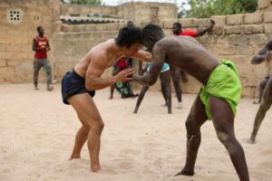 Shogo Uozumi, also known as Songo Tine, 29 years old, wrestles with Baye Ibra at the Samba Dia stable in the Diakhao neighbourhood, in Thies, Senegal, May 26, 2023. REUTERS/Ngouda Dione