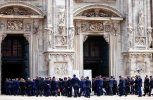 People walk to attend the funeral of former Italian Prime Minister Silvio Berlusconi at the Duomo Cathedral, in Milan, Italy June 14, 2023. REUTERS/Yara Nardi