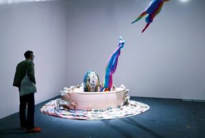 FILE PHOTO: A man looks at the sculpture “Holy Hell O” from 2018 by artist Kris Lemsalu at the Art Unlimited exhibition at the Art Basel art fair in Basel, Switzerland September 21, 2021. REUTERS/Arnd Wiegmann/File Photo