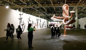 FILE PHOTO: People pose in front of the sculpture “Naughtynightcap” from 2008 by artist John Chamberlain at the Art Unlimited exhibition at the Art Basel art fair in Basel, Switzerland September 21, 2021. REUTERS/Arnd Wiegmann/File Photo