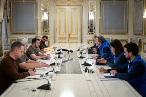 International Atomic Energy Agency (IAEA) Director General Rafael Grossi and Ukraine’s President Volodymyr Zelenskiy attend a meeting, amid Russia’s attack on Ukraine, in Kyiv, Ukraine June 13, 2023. Ukrainian Presidential Press Service/Handout via REUTERS
