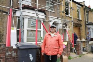 Ejaz Hussain stands in front of his house where solar panels are installed, in London, Britain, June 6, 2023. REUTERS/Anna Gordon