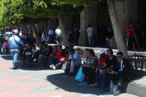 Personas sentadas mientras se cubren del calor durante un periodo de altas temperaturas en Ciudad de México, México 13 de junio de 2023. REUTERS/Henry Romero