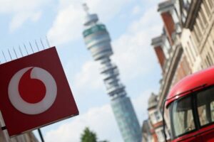 FILE PHOTO: Branding is displayed for Vodafone at one of its stores in London, Britain, June 14, 2023. REUTERS/Toby Melville/ FILE PHOTO