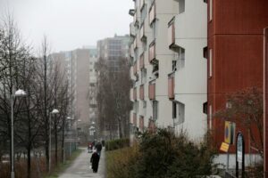 FILE PHOTO: People walk past apartment blocks in Stockholm April 8, 2014. Picture taken April 8, 2014. REUTERS/Ints Kalnins/File Photo