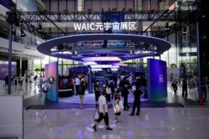 People visit a metaverse booth during World Artificial Intelligence Conference, following the coronavirus disease (COVID-19) outbreak, in Shanghai, China, September 1, 2022. REUTERS/Aly Song/File Photo