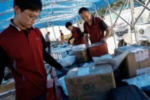 Delivery workers sort packages on a conveyor belt, ahead of the “618” shopping festival, at a logistics station in Beijing, China June 12, 2023. REUTERS/Tingshu Wang