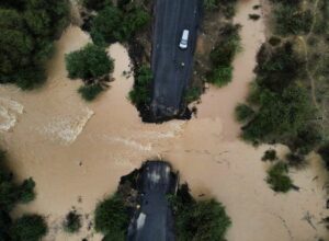 A drone view of a broken bridge during the aftermath of Cyclone Biparjoy after it made landfall, along the Naliya-Bhuj highway, in the western state of Gujarat, , India, June 16, 2023. REUTERS/Francis Mascarenhas