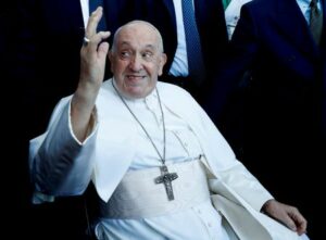 Pope Francis greets people on the day of his discharge from Gemelli hospital in Rome, Italy, June 16, 2023. REUTERS/Remo Casilli