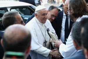 Pope Francis greets people after having been discharged from Gemelli Hospital in Rome, Italy, June 16, 2023. REUTERS/Guglielmo Mangiapane