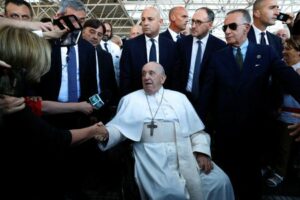 Pope Francis greets people on the day of his discharge from Gemelli hospital in Rome, Italy, June 16, 2023. REUTERS/Remo Casilli