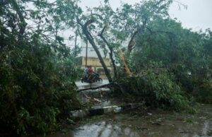 People ride past a fallen tree during the aftermath of Cyclone Biparjoy after it made landfall, in Bhuj in the western state of Gujarat, India, June 16, 2023. REUTERS/Francis Mascarenhas