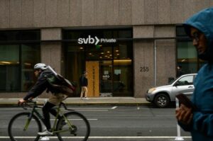 FILE PHOTO: Pedestrians and a cyclist pass by the Silicon Valley Bank branch office in downtown San Francisco, California, U.S., March 13, 2023. REUTERS/Kori Suzuki/File Photo