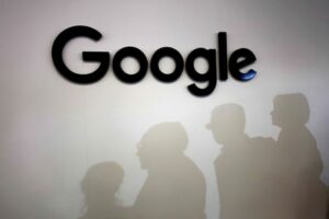 FILE PHOTO: Visitors cast their shadows past the logo of Google at the Viva Technology conference dedicated to innovation and startups at Porte de Versailles exhibition center in Paris, France, June 15, 2023. REUTERS/Gonzalo Fuentes/FILE PHOTO