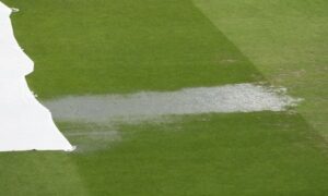 Cricket – Ashes – First Test – England v Australia – Edgbaston Cricket Ground, Birmingham, Britain – June 18, 2023 General view of puddles on the field during a rain delay Action Images via Reuters/Andrew Couldridge