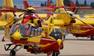 FILE PHOTO: An Airbus H145 French Securite Civile rescue helicopter takes off past Canadair aircrafts during the presentation of the 2023 plan to fight against wildfires, at Nimes-Garons airbase, France, April 25, 2023. REUTERS/Christian Hartmann/File Photo